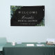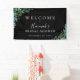 Elegant watercolor botanical greenery, personalised event banner. Classic black background colour and chic white typography.