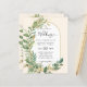Modern green leaves with gold accents themed wedding invitation, modern arch.