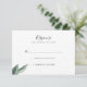 A wedding response card co-ordinating with our clean, elegant and modern wedding invitation, featuring watercolor green leaves on a white background, and elegant dark grey text. The reverse is in solid grey.