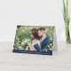 This elegant wedding thank you card features a modern, silver look geometric frame with a trendy green leaf-filled wreath on a midnight blue background, with your personal wedding photo.