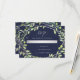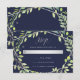 This elegant wedding response card features a modern, silver look geometric frame with a trendy green leaf-filled wreath on a midnight blue background.