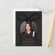 This elegant monochromatic black graduation party photo invitation features a chic black bow with modern circular photo and gold colour text on a simple charcoal black background. The back of the graduate postcard invitation includes graduation party details with classic personalised return address.