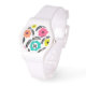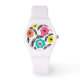 Modern and bold flower pattern in summer colours with black leaf decoration on personalised watch.