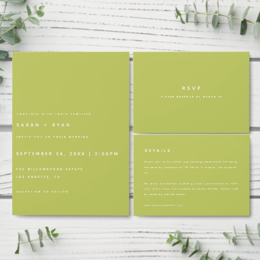 Modern Bright Lime Green Wedding Menu. Customize with bride and groom names, your wedding date, and your starters, entrées, and desserts.