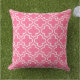 Stylish pillow features a modern decorative Moroccan quatrefoil pattern in white. Customise the bright pink background to coordinate with your outdoor decor.