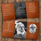 This refined celebration of life memorial card features a rich rust brown leather background paired with elegant white script and serif fonts, offering a warm and heartfelt tone. The front panel includes a circular photo frame and beautifully typeset tribute text, providing a dignified introduction to the life being remembered. The interior design is thoughtfully organised to guide the order of service, include acknowledgements, and feature a touching message or poem, or any other text of your choice, all enhanced by black and white photo panels. This template offers a balance of sophistication and sentiment, making it ideal for memorial services or celebration of life events. The overall aesthetic evokes warmth, gratitude, and remembrance, helping families honour their loved one with grace and meaning.