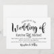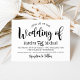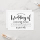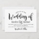 A bold landscape wedding invitation featuring oversized black brush script "Wedding of" lettering with a compact, horizontal layout on a clean white background. The streamlined format pairs hand-lettered headers with clean serif details and dot-separated date and venue lines. All text is fully editable for your celebration.