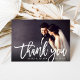 A modern and bold wedding thank you card featuring a full-bleed couple photo with a large brush-style white calligraphy "thank you" script sweeping dramatically across the image. The couple's names and wedding date are fully editable for a personal touch. The casual yet bold brush script gives this card a contemporary, editorial feel. The folded card interior is available for a handwritten note or custom printed message.