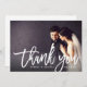 Stylish wedding flat thank you note card template features a rustic brushed script "thank you" overlay design with modern monogram and a landscape photo of the bride and groom on the front side. Includes a second portrait photo and black custom thank you message text that can be personalised on the back of the card.