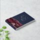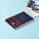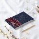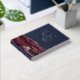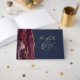 This elegant wedding guest book features a burgundy watercolor agate design trimmed with faux gold glitter. Easily customise the real gold foil text on a navy blue background, with the names of the couple in whimsical handwriting calligraphy over a large ampersand. Add additional text of your choice to the front and spine.