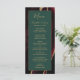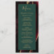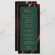 This elegant, modern wedding menu features a watercolor burgundy agate background trimmed with gold faux glitter. The text appears in elegant gold-coloured handwriting and copperplate fonts on an emerald green rectangle. The agate design is repeated on the reverse.