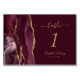 The left-hand edge of this elegant modern wedding table number card features a burgundy watercolor agate border trimmed with faux gold glitter. The customizable text combines gold colored handwriting, italic and copperplate fonts on a burgundy red background.