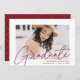 Invite guests to celebrate the graduation with our modern photo graduation party invites. The trendy graduation party invites feature the graduate's photo with "Graduate" in a burgundy modern calligraphy script overlay. Personalize the front of the invites by adding the graduate's name, school name, and graduation year. The invite reverses to display your graduation party details and a trendy burgundy and white dotted geometric pattern.