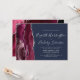 The left-hand edge of this elegant modern wedding invitation features a burgundy watercolor agate border trimmed with faux silver glitter. The customisable text combines handwriting, copperplate and italic fonts in silver grey on a navy blue background. The reverse side features a matching burgundy and silver agate design.