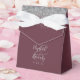 The front flap of this elegant modern wedding favour box features a silver faux glitter border. The customisable text combines silver grey handwriting and copperplate fonts over a large ampersand on a dark burgundy background.