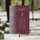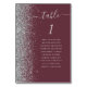 The left-hand edge of this elegant modern wedding table number card features a silver faux glitter border. The word "table" appears in silver grey whimsical handwriting script on a dark burgundy background. Add the names of your guests who are assigned to each table.