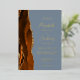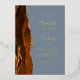 The left-hand edge of this elegant modern wedding invitation features a burnt orange watercolor agate border trimmed with faux gold glitter. The customisable text combines handwriting, copperplate and italic fonts in real gold foil on a dusty blue background. The reverse side features a matching burnt orange and gold agate design.
