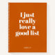 Calling all lovers of a good to-do list! This notebook with a bold cover in burnt orange features "I just really love a good list" - because who doesn't? You can customise the text on the cover and the name on bottom. Interior pages are checklist by default but can be changed in the menu. Happy list making!