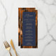 This elegant, modern wedding menu features a watercolor burnt orange agate background trimmed with gold faux glitter. The text appears in elegant gold-coloured handwriting and sans serif fonts on a navy blue rectangle. The agate design is repeated on the reverse.