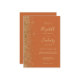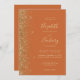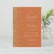 The left-hand edge of this elegant modern wedding invitation features a gold faux glitter design. The customisable text combines pale gold-coloured handwriting, copperplate and italic fonts on a burnt orange background. The reverse side provides space for wedding details on a solid background, along with a QR code guests can scan to visit your website and RSVP, which saves the cost of printing and mailing separate RSVP cards.