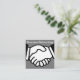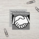 Business networking business card template in a unique square format with image of shaking hands representing partnership and cooperation and your contact information on the flip side.