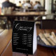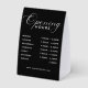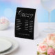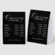 This table tent sign features a sleek black background with modern, easy-to-read typography. The high-contrast design ensures clear visibility on counters, desks, and tables.