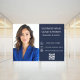 Modern business window cling with photo, contact info, and QR code. Perfect for real estate agents, salons, boutiques, and offices. Easy to customise with your own branding to create a professional and welcoming storefront display. Navy blue background, white text.
