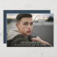 Modern calligraphy, black script photo overlay, photo graduation announcement. Backing colour shown in navy blue can be customised.