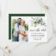Modern Calligraphy Script Elegant Watercolor Botanical Greenery Wedding Engagement Announcement Photo Save The Date Card includes eucalyptus leaves, green botanical foliage, dusty blue leaves and other beautiful botanical greenery. Green Back.