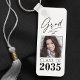 A trendy, new two sided, sturdy aluminium, Graduate keychain - keyring with your photo on the front. All Personalised, featuring "Grad" in elegant calligraphy ink script with "Class of, The Year, School Name & Your Name" in modern typography. The graduate's photo is artfully accented with a delicate gradient boarder. The text and trim are regal black with the background in white. If you wish, easily edit the background colour to your school's primary colour. The perfect Graduation gift idea for high school, college and university students.