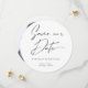 Modern classy calligraphy circle save the date card with minimal text on the front, simple black and white colour palette and your image of choice on the back. Customise this round save the date card it with your own photo, names, wedding date and location and make it uniquely your own. All colours (text and background) are customizeable too.