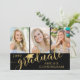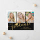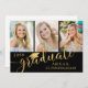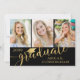 Modern photo collage graduation announcement featuring 3 photos on the front and 1 on the back with metallic gold calligraphy script typography for the title GRADUATE accented with a graduation cap or mortarboard and personalized with your graduate's name and class year against an editable black background--select a different color or choose from a variety of styled graphics backgrounds. The back includes details about your graduate. ASSISTANCE: For help with design modification/personalization, transferring the design to another product or if you would like coordinating items, contact the designer BEFORE ORDERING via Zazzle Chat or makeitaboutyoustore@gmail.com.