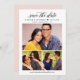Announce your wedding in style with these chic save the date announcement cards that feature a collage of three (3) engagement photos with a modern calligraphy script design and custom text that can be personalised with all of the important details. The back features blush pink (colour can be customised) background colour.