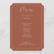 This modern Terracotta wedding menu card in ticket shape features modern calligraphy and contemporary typography. Perfect for a modern yet classic wedding or other event, wedding with a Terracotta colour theme or elegant wedding. On the back is room for your names and wedding date - or simply delete the text on the back. This wedding menu is also available with another calligraphy font and slightly different sans serif font for the main text - have a look in my shop.