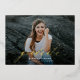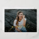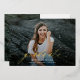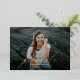This graduation announcement features a large, full front photo with calligraphy script overlay and a second photo on the back along with your graduation party invitation. The back elements can be removed by clicking the button to edit further.