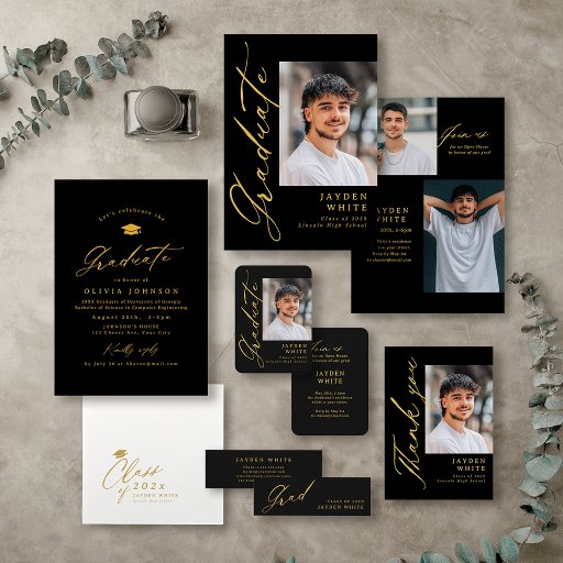 Black and white simple graduation invitation with modern hand written calligraphy and grad cap, personalised photo on the back, simple and unique. Custom it with your own photo and grad party information.