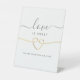 Elegant, simple white wedding Love is Sweet tabletop sign with faux gold rope heart and modern calligraphy script.