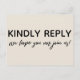 In editable text "kindly reply" was placed, large and bold, on the front. In a modern casual handwriting, a graphic depicting "we hope you can join us!" appears below. On the back, the same unique font was used to create graphics that read "rsvp", "m" and "kindly deliver to:" and all other text is editable. Use the template fields to personalise as much as you wish. The front has an elegant background that can be changed to any colour you prefer. // 100 //