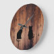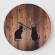 Modern cat silhouettes, pets, on rustic dark wood background clock.