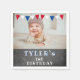 Modern Chalkboard Photo 1st Birthday Party Napkin / Cute birthday party napkin for a 1st birthday party with a custom photo. The design has bunting flags in red, white and blue colours and a chalkboard background. Personalise this birthday party napkin with a child`s photo and child`s name.