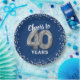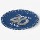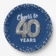 Elegant fortieth birthday party paper plates featuring a trendy blue background that can be changed to any colour, silver sparkly glitter, and the saying "cheers to 40 years" using forty silver hellium balloons.