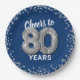 Elegant eightieth birthday party paper plates featuring a trendy blue background that can be changed to any colour, silver sparkly glitter, and the saying "cheers to 80 years" using eighty silver hellium balloons.