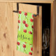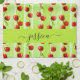 Modern kitchen towel with a cherry pattern on green stripes and a feminine, hand lettered script name. Personalise with your name.