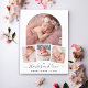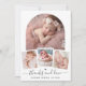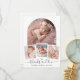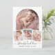 It features your precious baby’s photo within a stunning white arch frame that adds a touch of sophistication and grace, below the central image, three smaller photos are elegantly arranged within a thin white frame, allowing you to share more special moments. At the bottom of the card, your baby’s information is displayed in an elegant calligraphy font, adding a personal and stylish touch.