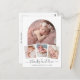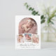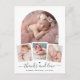 It features your precious baby’s photo within a stunning white arch frame that adds a touch of sophistication and grace, below the central image, three smaller photos are elegantly arranged within a thin white frame, allowing you to share more special moments. At the bottom of the card, your baby’s information is displayed in an elegant calligraphy font, adding a personal and stylish touch.