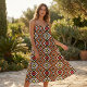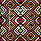 Seamless decorative pattern featuring geometric shapes in red, yellow, orange, black and white.