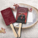 The back boasts a stylish reddish backdrop and features the complete wedding ceremony program in clear detail.
