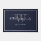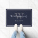 Modern Chic Monogram Script Name Wedding Welcome Doormat. Personalised white, grey monogram design with bride and groom last name and date established on a navy blue background. A unique cool gift for newlyweds. Lovely for their new life together. Click personalise this template to customise it quickly and easily. Ships Worldwide fast.