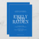 The wedding invitation features a minimalist design with an sapphire blue background and a clean, symmetrical layout. It uses elegant serif fonts, with the couple's names prominently displayed in large, overlapping text for a bold and modern touch. The remaining details are arranged in a smaller, clear font, maintaining simplicity and sophistication, blending contemporary and traditional aesthetics.