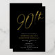 This modern 90th birthday party invite features a chic black background with raised gold foil script and flat white modern typography. The script says "90th". All of the colours are fully and easily customisable. You can even add a photo to the back! Just use "design tool" in the personalisation drop-down menu. Raised foil is available in gold, silver, and rose gold. Choose real foil printing to add the wow factor to your next party invitations!